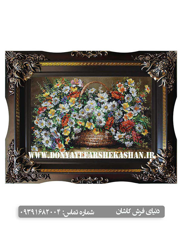تابلو فرش طرح گل در سه سایز 50*70 سانتی متر و 50 * 100 سانتی متر و 70 * 100 سانتی متربه صورت 1000 شانه با تراکم 3000 به عنوان یک اثر ماندگار در محیط های اداری و منازل است.
